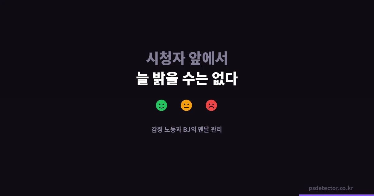 강제적 밝음 — 컨디션이 안 좋은 날에도 카메라를 켜면 '방송 모드'로 전환해야 합니다. 시청자는 BJ의 사정을 모르고, 항상 재미있고 밝은 모습을 기대합니다. 개인적인 고민이 있어도, 몸이 안 좋아도, 방송 버튼을 누르는 순간 웃어야 합니다.
