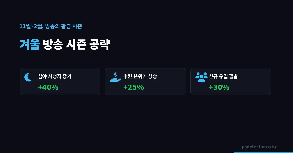 11월 말부터 2월 초까지는 인터넷 방송의 황금 시즌입니다. 날씨가 추워지면서 외출이 줄고, 연말연시 휴가 기간에 집에서 보내는 시간이 늘어나면서 자연스럽게 인터넷 방송 시청 시간도 증가합니다. 이 시기를 어떻게 활용하느냐에 따라 한 해의 성장폭이 달라질 수 있습니다.