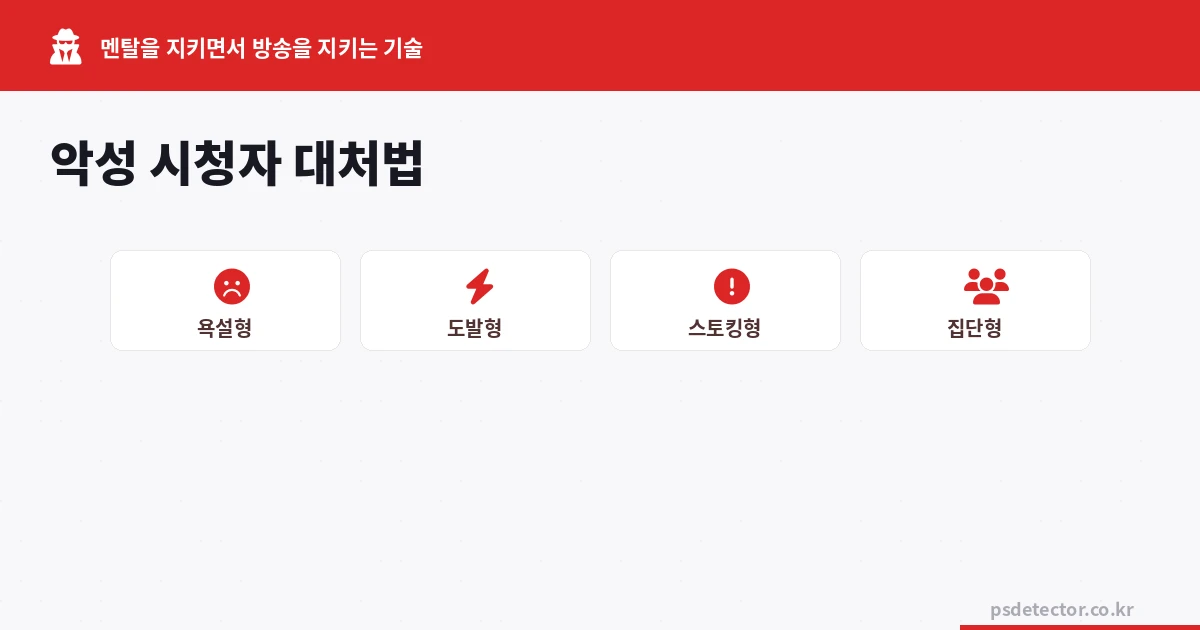 악성 시청자는 인터넷 방송의 일부입니다. 피할 수 없지만, 올바른 대처법을 알면 통제할 수 있습니다. 감정적으로 반응하지 않고, 필요하면 단호하게 강퇴하고, 방송의 주도권을 유지하세요. 99명의 좋은 시청자를 위해 방송을 계속하는 것, 그것이 악성 시청자에 대한 가장 좋은 대답입니다.