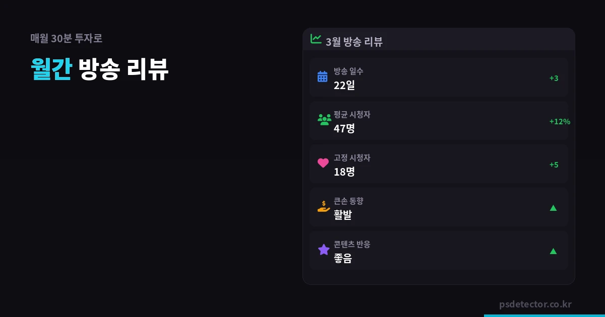 시청자 수가 서서히 줄고 있는데 본인만 모르는 경우가 있습니다. 반대로 꾸준히 성장하고 있는데도 "요즘 안 되는 것 같다"고 잘못 판단하는 경우도 있습니다. 월간 리뷰는 이런 오판을 방지하는 최소한의 장치입니다.