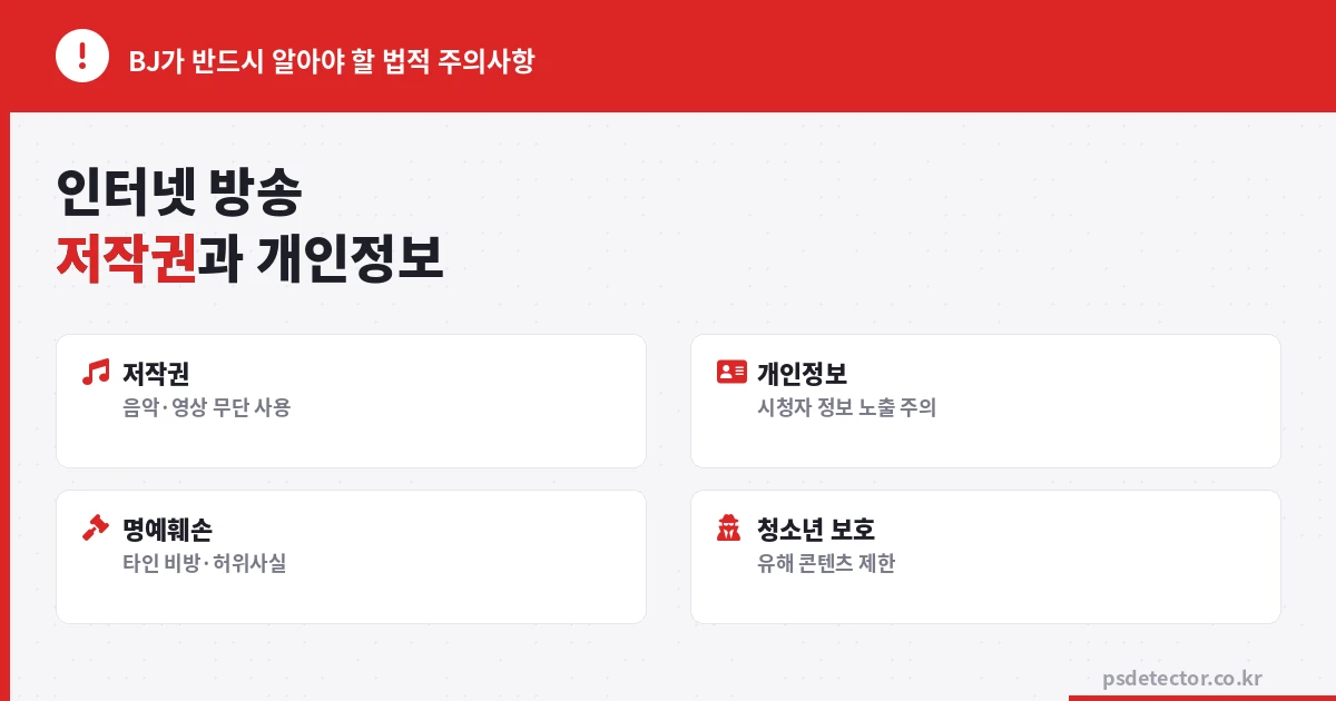 이 글에서는 인터넷 방송 BJ가 반드시 알아야 할 법적 주의사항을 저작권, 개인정보, 명예훼손, 청소년 보호 네 가지 영역으로 나누어 정리합니다. 법률 전문 용어는 최소화하고, 실제 방송 상황에 적용할 수 있는 수준으로 설명합니다.