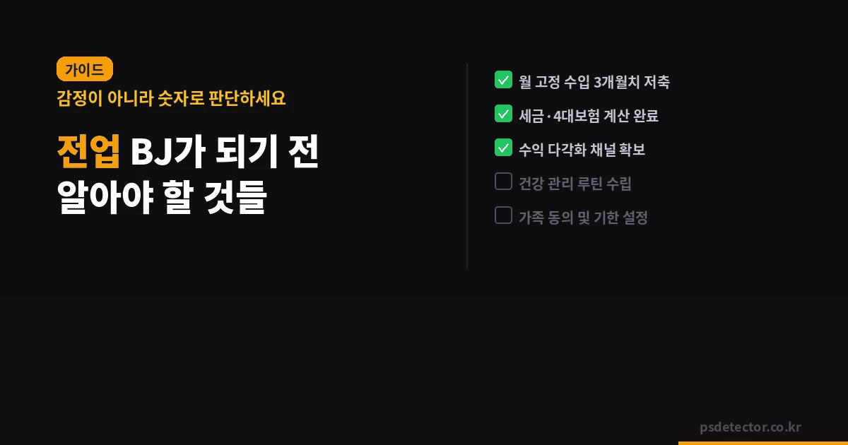 전업 BJ는 자영업자와 같습니다. 고정 월급이 없고, 수익이 매달 다르고, 사회 안전망(4대 보험, 퇴직금 등)이 없습니다. 이런 구조적 특성을 이해하고 대비한 사람과 그렇지 않은 사람의 차이는 1년 후에 극명하게 갈립니다.
