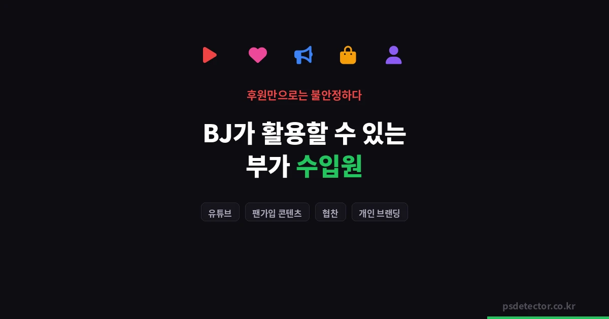 이 글에서는 BJ가 현실적으로 활용할 수 있는 부가 수입원을 정리합니다. 모든 채널이 모든 BJ에게 맞는 건 아니니, 본인 상황에 맞는 것을 골라 시도해보세요.