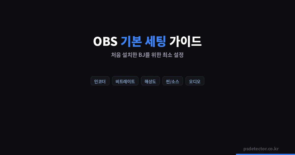 OBS 세팅은 한 번 하면 크게 바꿀 일이 없습니다. 처음 30분~1시간 투자해서 제대로 잡아두면 그 이후로는 방송 시작 버튼만 누르면 됩니다. 세팅에 너무 많은 시간을 쏟지 말고, 기본만 잡은 후 방송을 시작하면서 필요한 부분을 점차 개선하세요.